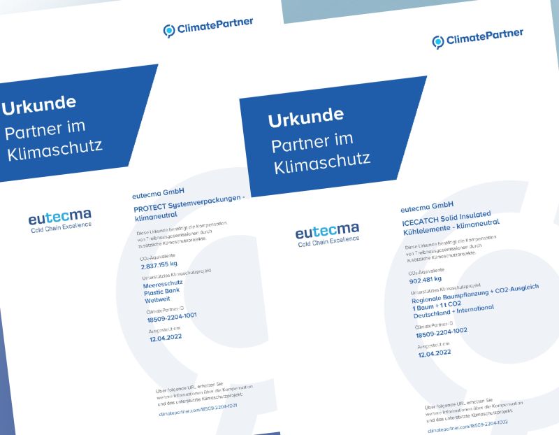 Seit kurzem ist es offiziell: Die ICECATCH©-Kühlelemente und PROTECT-Boxen von eutecma sind klimaneutral! Wir müssen gestehen: Als die Urkunden von ClimatePartner uns ins Haus flatterten, knallten die Sektkorken. Denn der kleinen Feierstunde war ein aufwändiger Zertifizierungsprozess durch ClimatePartner vorausgegangen.