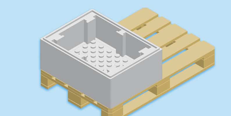Die intelligente Konstruktion korrespondiert aber nicht nur mit dem modularen Boxendesign und der Kompatibilität von Box und Kühlelement. Sie wird perfektioniert von der äußerst soliden Form des Boxen-Unterteils: Die L-förmigen Winkelstücke sind so gestaltet, dass sie von allein stabil stehen. Damit ist es einem (1) einzigen Lagermitarbeiter möglich, die PROTECT ½ Euro Palettenbox allein aufzubauen – in unter 30 Sekunden(!).